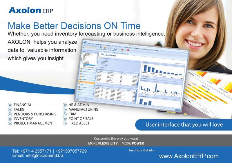 Axolon ERP Software Dubai,UAE,ME delivers user friendly,customizable ERP with all latest functionalties,features and reporting tools to all SMBS.call 042557171