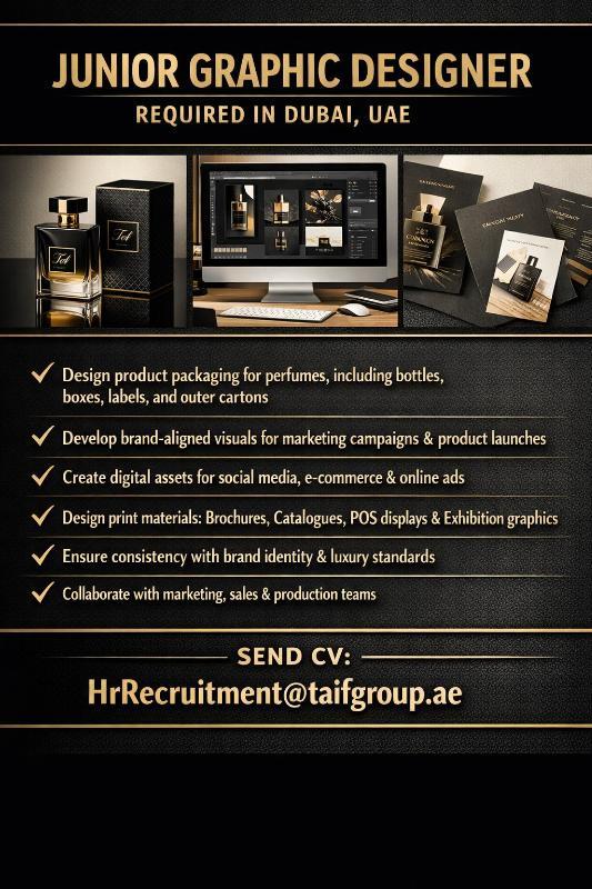 Taif Group (Perfume Industry) is looking for a creative Graphic Designer with a strong background in the perfume and cosmetics industry. With a minimum of 2 years’ experience in UAE, the successful candidate will craft impactful visuals that bring the brand to life, engage customers, and support retail and marketing initiatives. You will be working closely with cross-functional teams to ensure flawless execution from idea to final output.