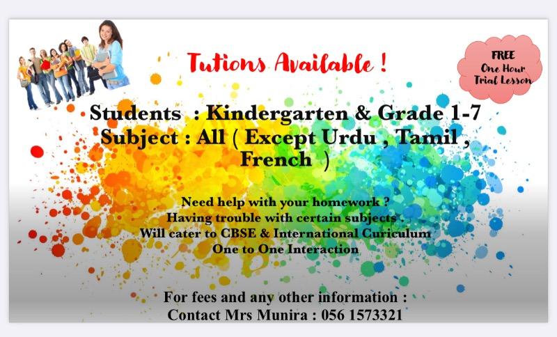 Tution available for KG - Grade 7 for All subjects